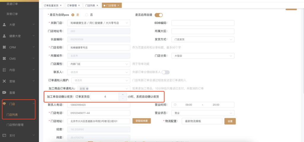 《知嘛健康运管平台-加工单自动确认收货》徐, 雯雯2023年11月9日知嘛健康生活 加工单可自动确认收货 加工单自动确认收货 在门店-选择具体门店-店铺管理-基础信息页面,可以看到加工单自动确认收货一行,可在此填写订单发货后多久,订单可以自动确认收货,此项解决的主要问题是像零号店这样的自配送
