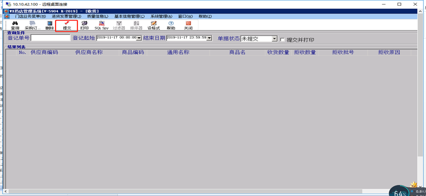 录入验收的信息, 点击上边保存按钮, 录入的信息将会显示到明细列表中,选中记录,点击提交即可验收完成